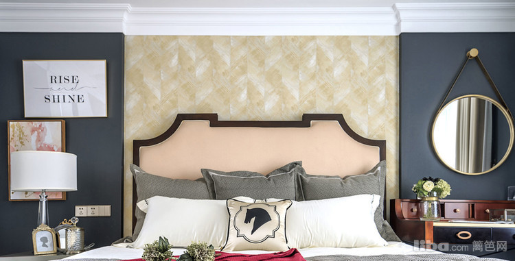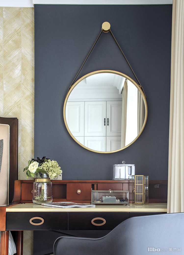 只用简洁的色彩,和层次去烘托主位的仪式感。原木的梳妆台,太阳挂镜