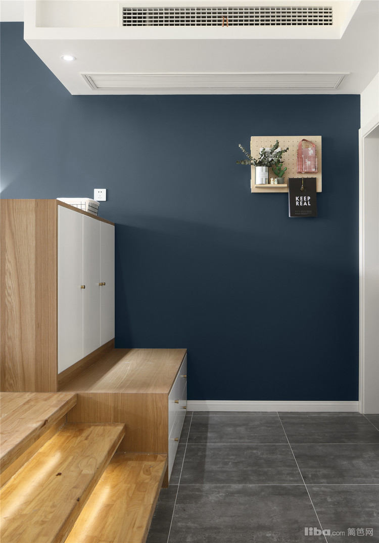 踏步加长并做了暗藏灯,将楼梯与玄关鞋柜结合成整体,鞋柜做了半高刚好挡住沙发,又不完全遮挡视线,踏步延伸向门厅的尽头做了一组换鞋凳,换鞋凳与踏步侧面齐平,材质与色调都保持了整体性。