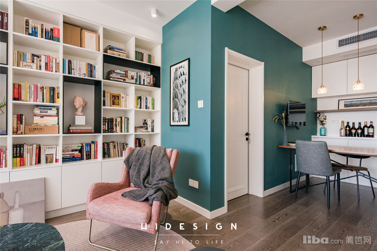 超大书柜+展示柜的组合,沙发背景墙又实用又特别