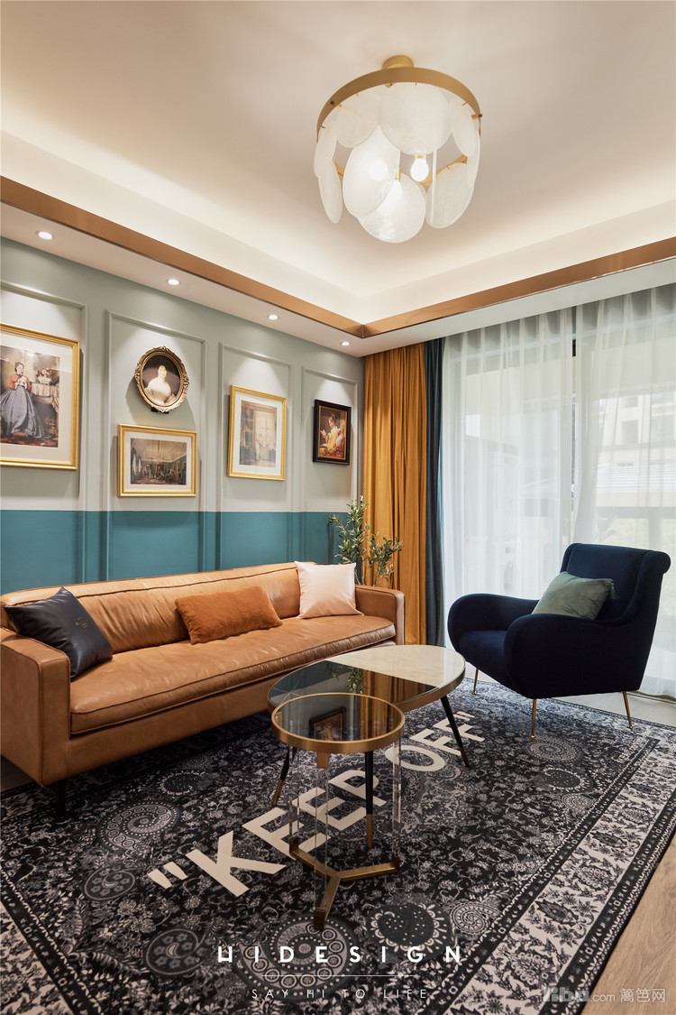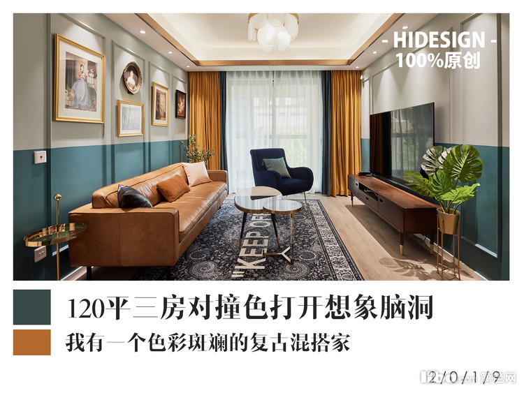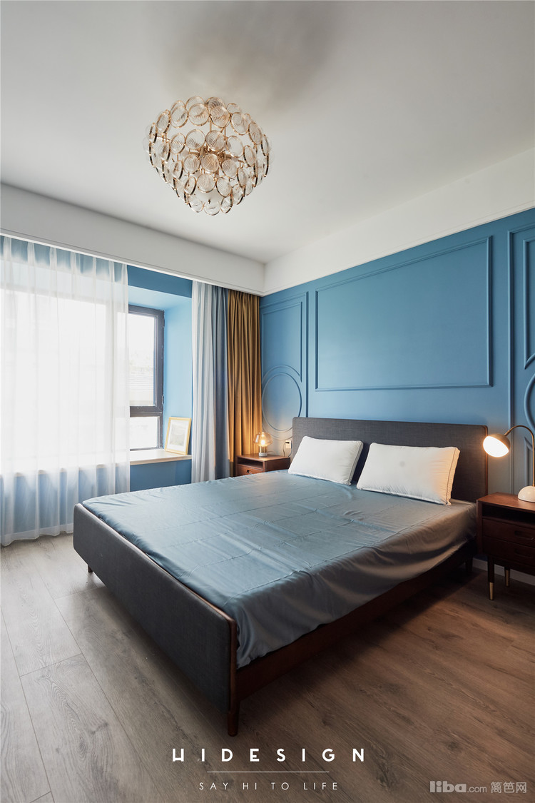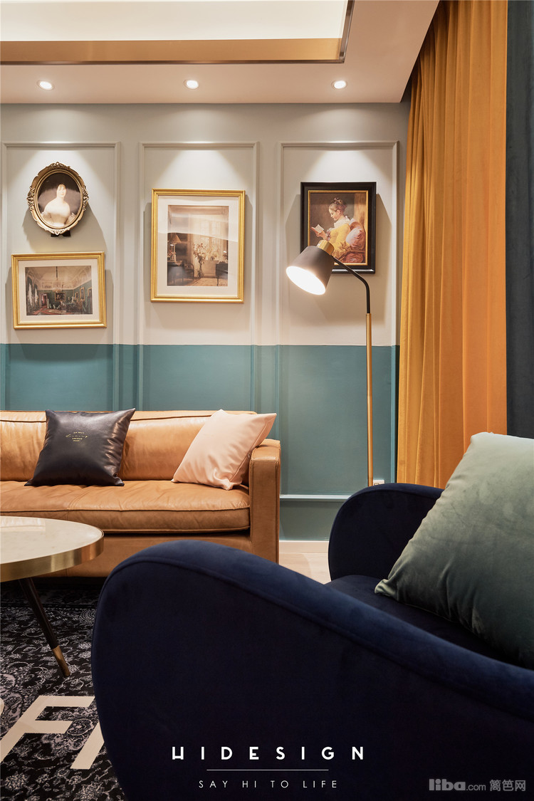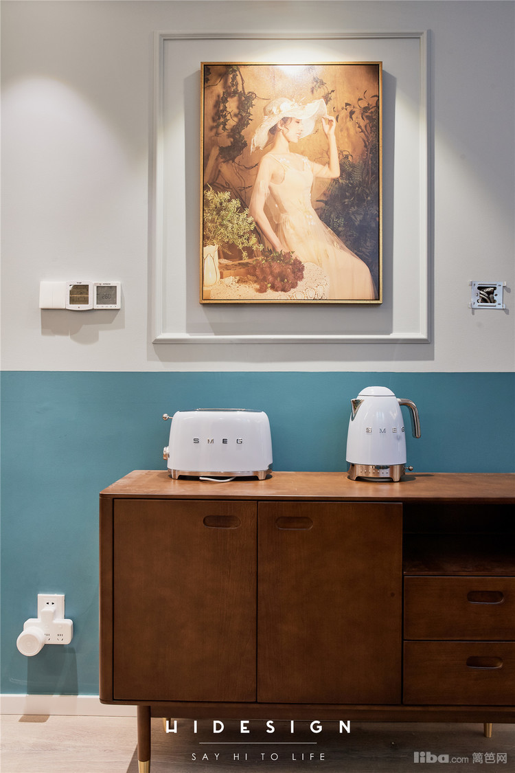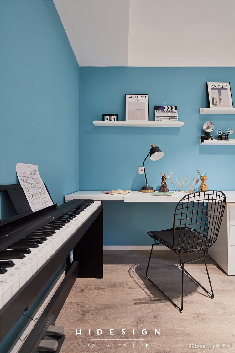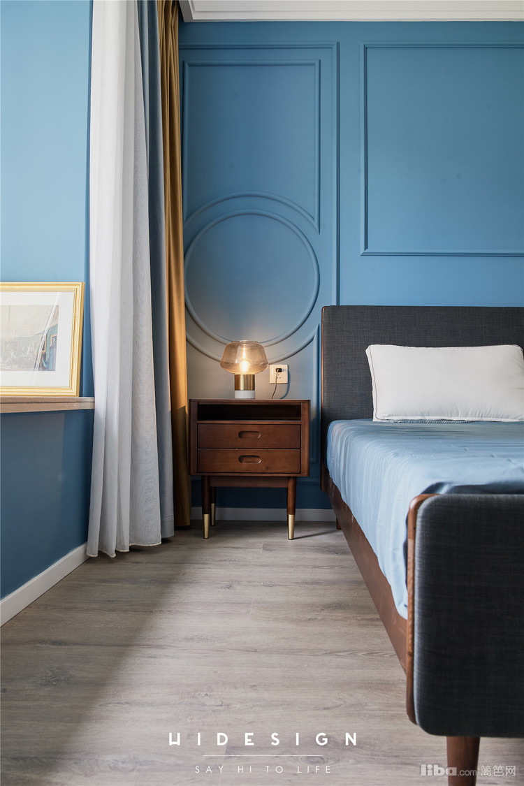 运用蓝绿色和桔色打造撞色的视觉冲击,活力又复古。卧室则是宁静的深蓝色,辅以线条装饰 。