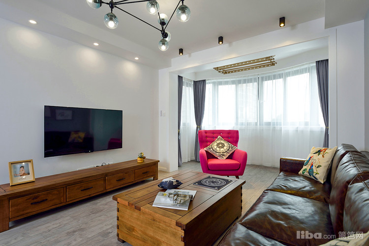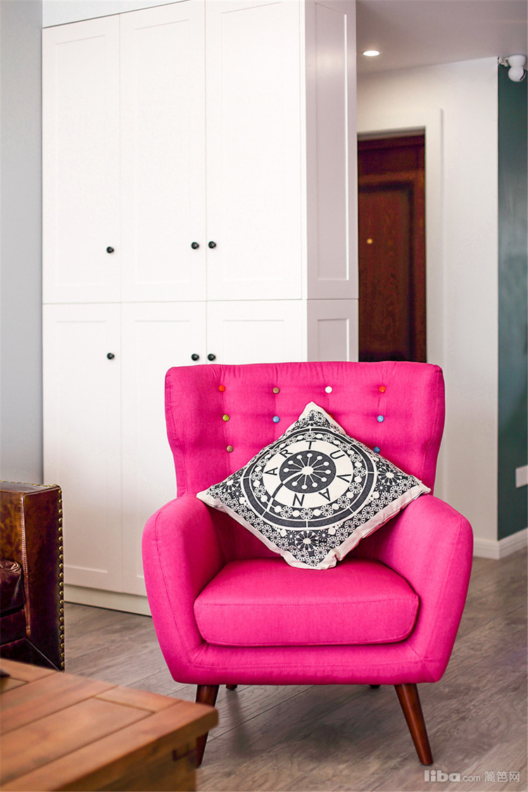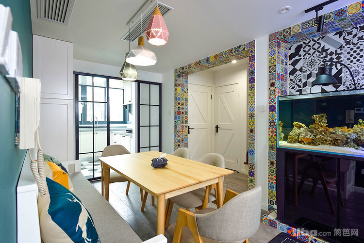 鱼缸是一道亮丽的风景线,错乱的花砖铺贴是整体随性前卫。