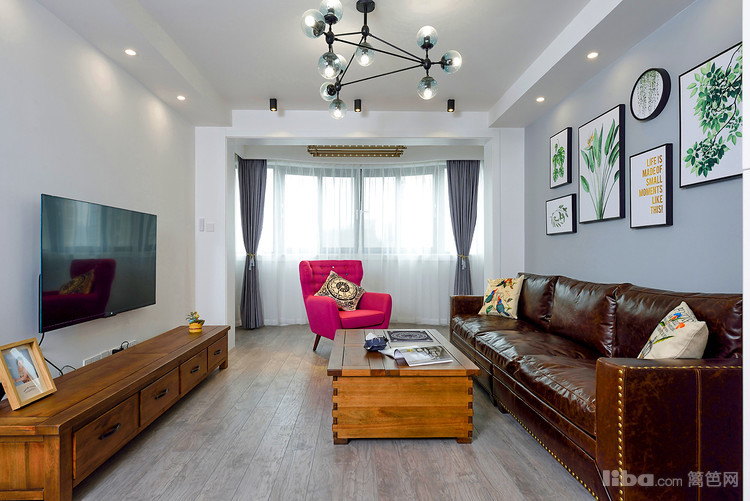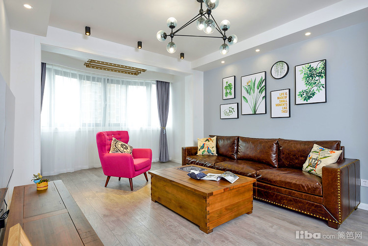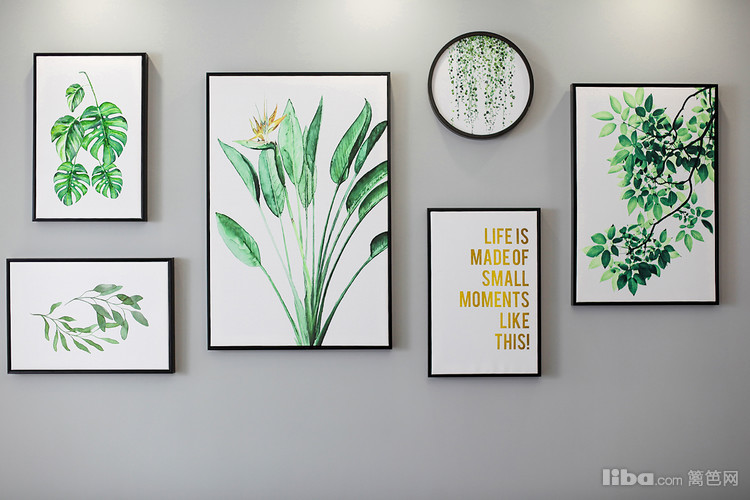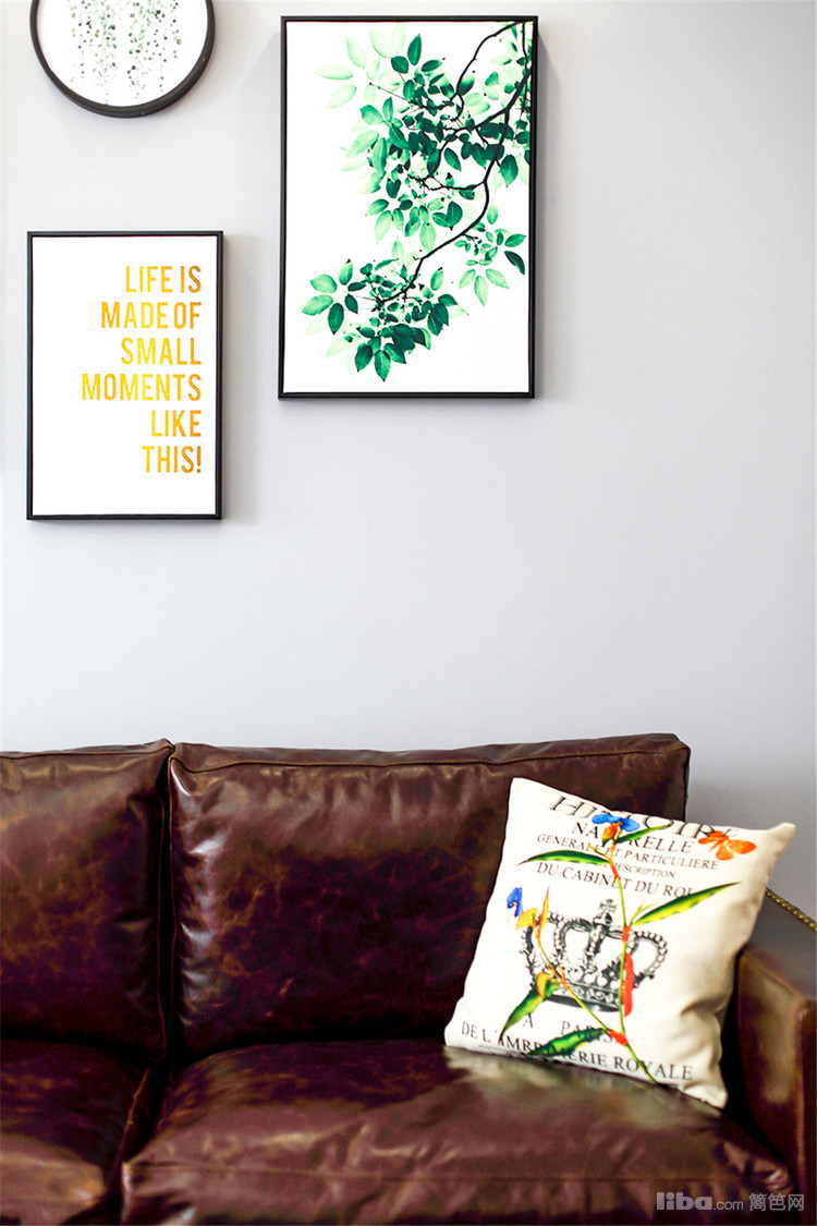 沙发背景墙的挂画主要以绿色植物为主色调,生机盎然。