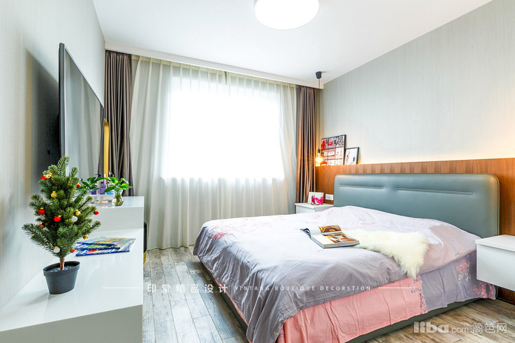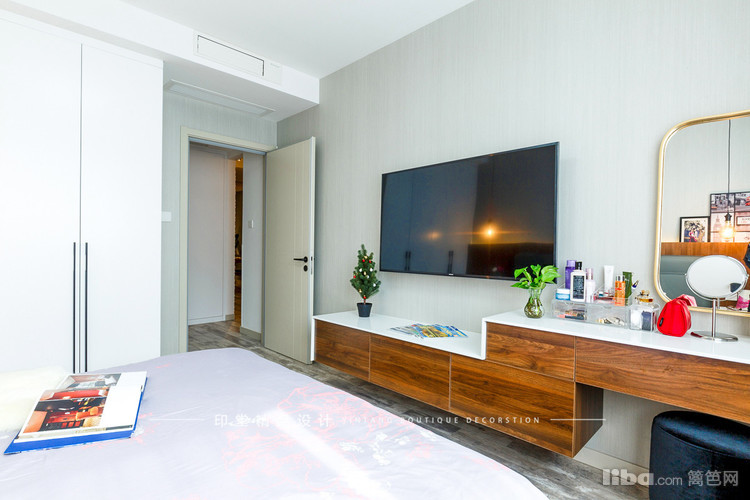 主卧墙面使用了淡灰色为主色系,搭配简洁的柜门、床品,营造出静谧和谐的氛围。