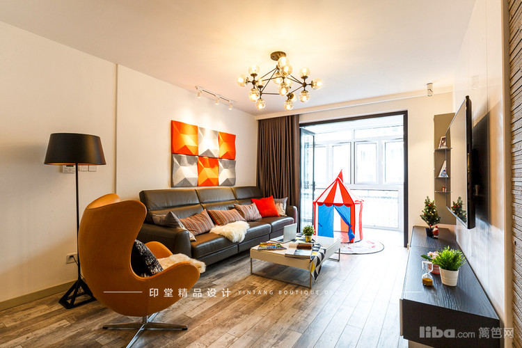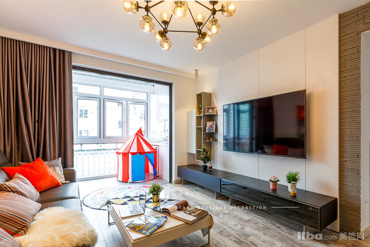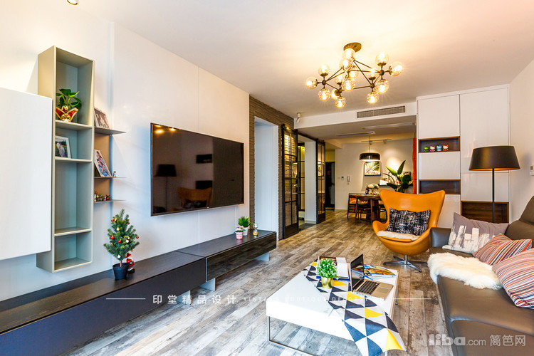 电视背景墙已白色光面为主,搭配了不规则的收纳吊柜。