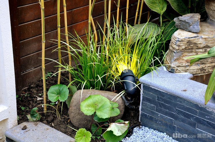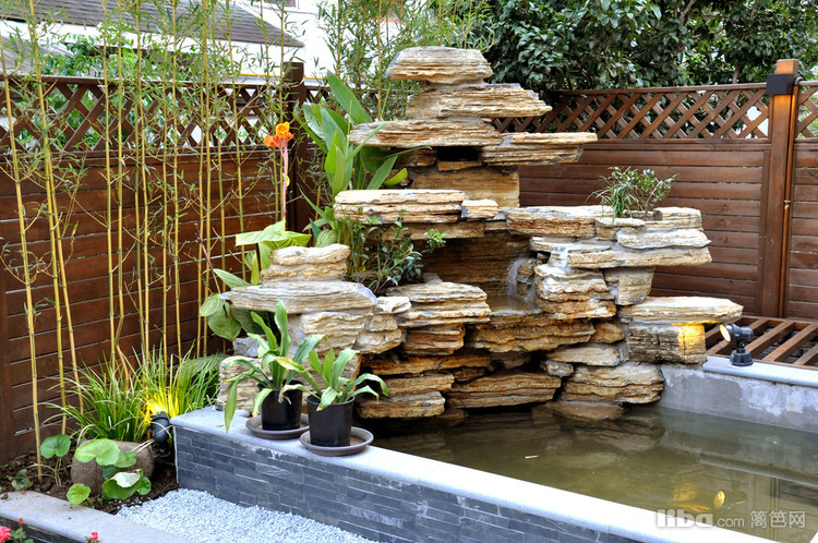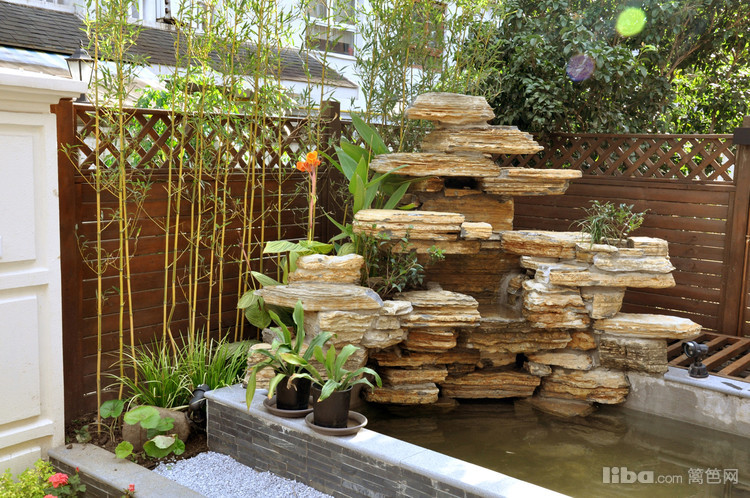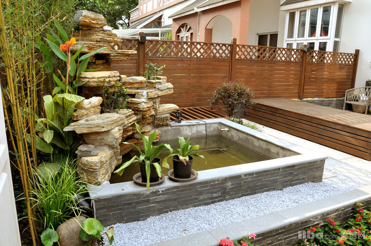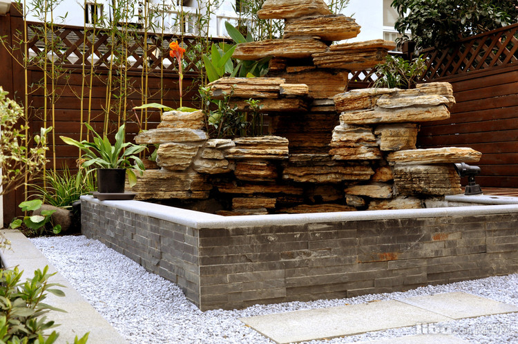 透过室内窗户假山叠水直接映入眼帘,方形式的水池和自然式假山组合造景,通过假山高度上的变化,形成景深感