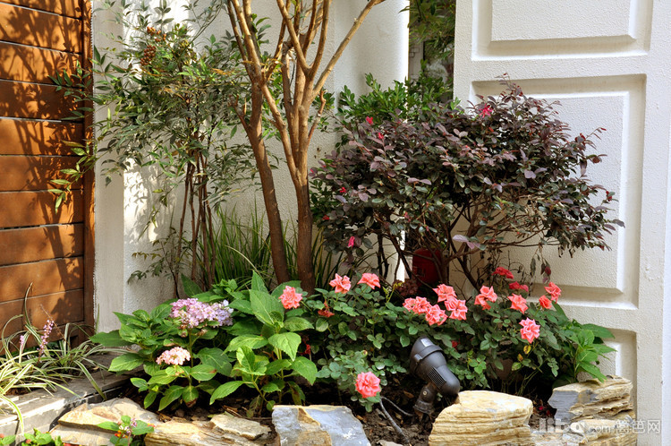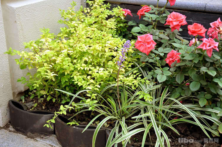 古朴小灰瓦巧妙的隔离了花坛小景和路面,花坛内用月季、金叶麦冬、亮叶女贞等植被凸显了不同的生命力。