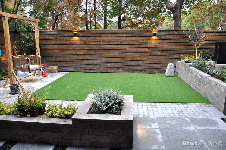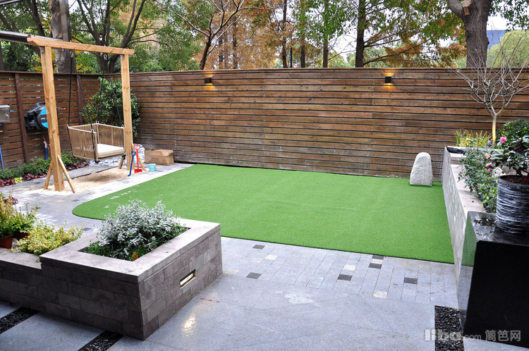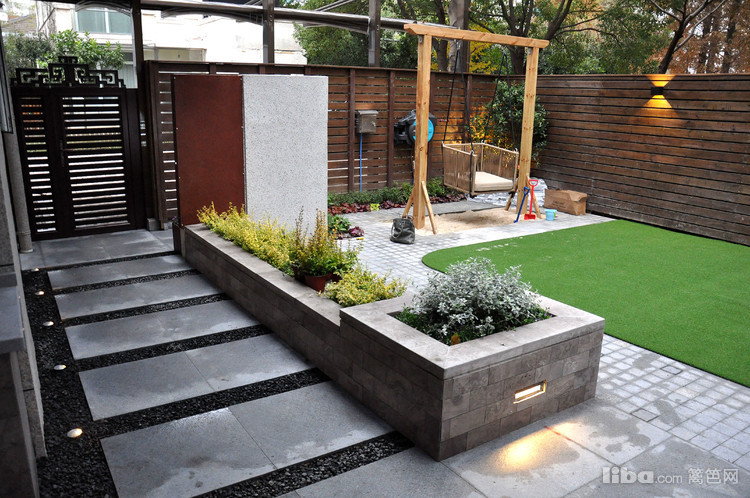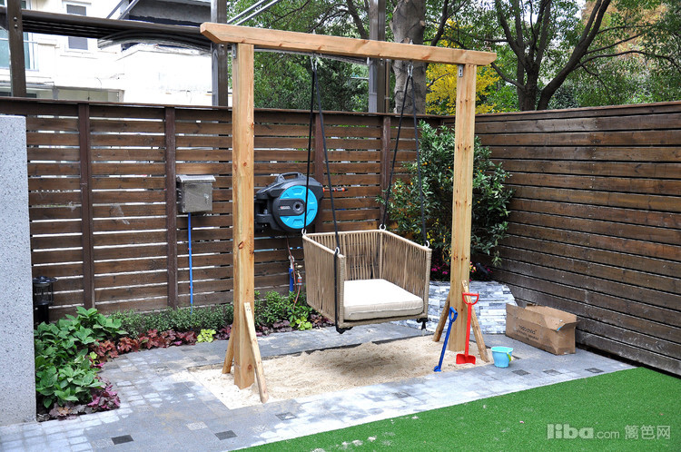 儿童玩乐区将秋千与沙坑相结合,有效的节约空间,让庭院一角成为宝宝流连忘返的趣味区域。