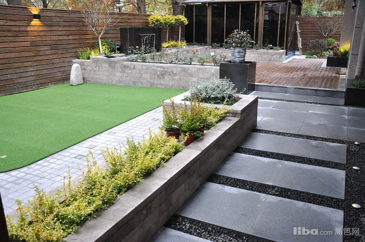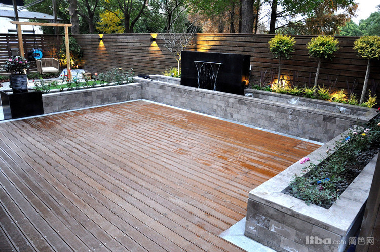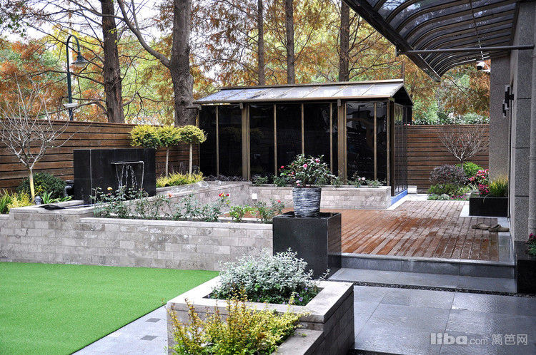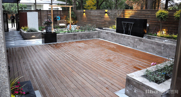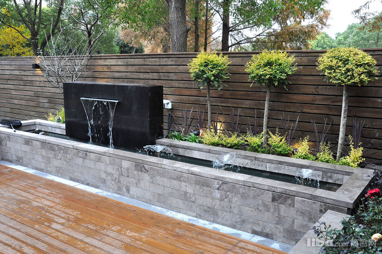 跌水景墙,是花园的焦点所在,而亲水木平台连接室内餐厅,让人在就餐的同时也能欣赏流水带来的静谧舒适。