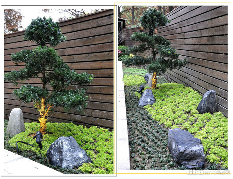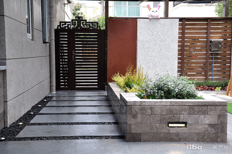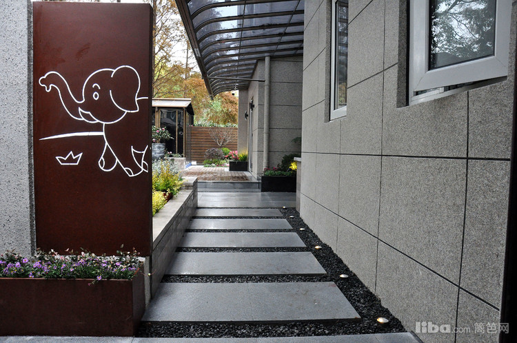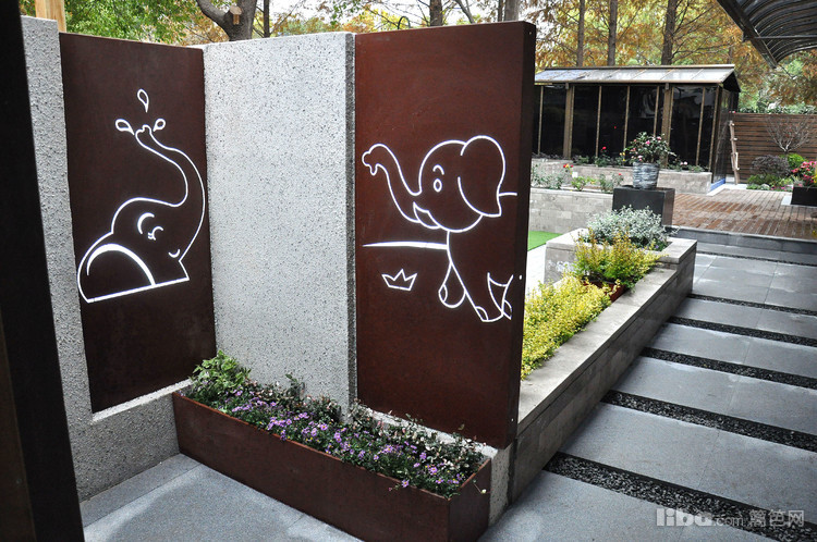 推开花园门,小象铁锈板搭配真石漆景墙的玄关映入眼帘,一进门就能感受到这是个趣味感十足的花园。