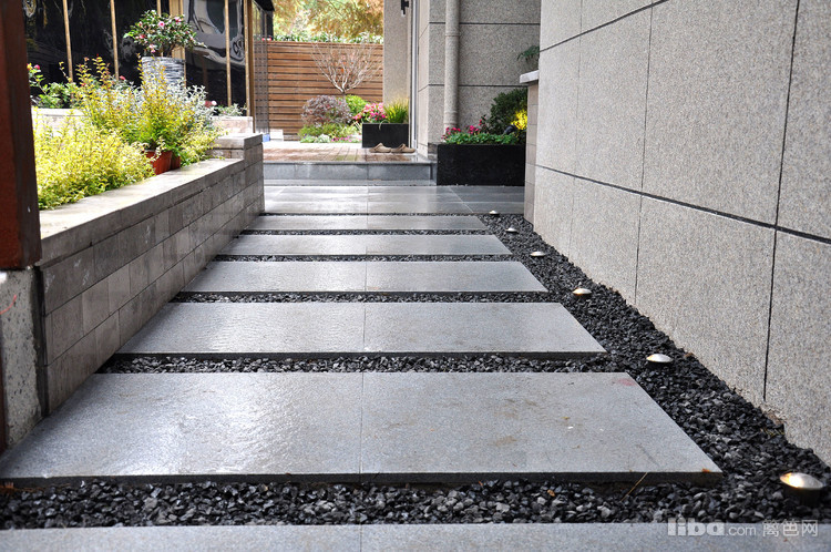 入园步道与风雨廊相结合,运用砂砾与射脚灯搭配,来照亮主人进园的脚步。