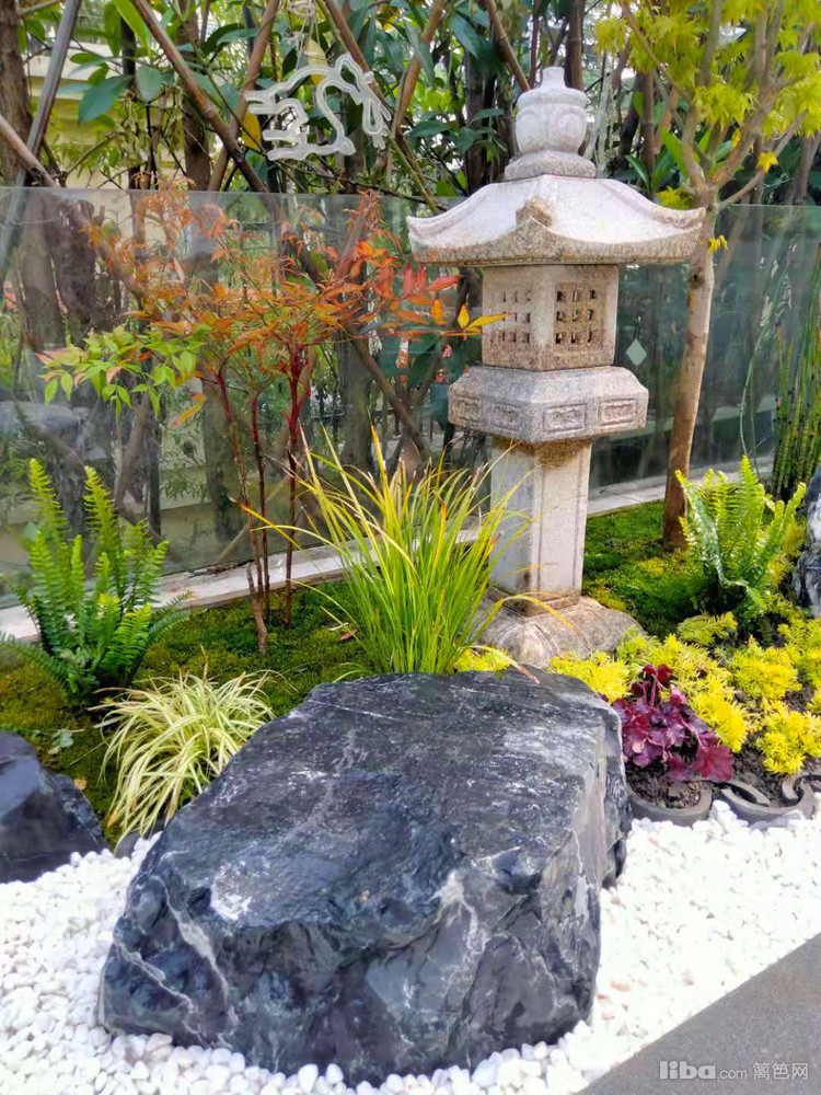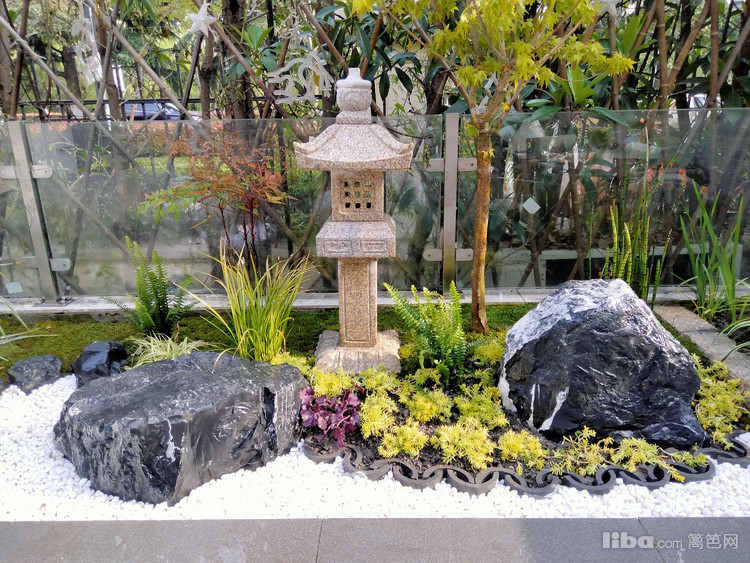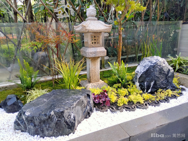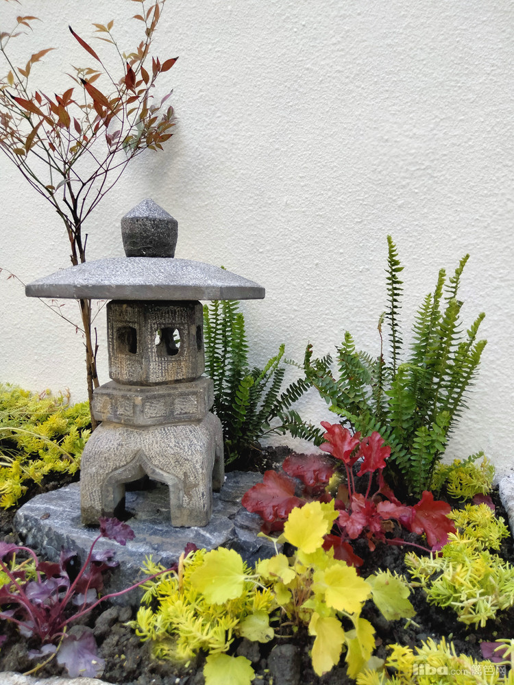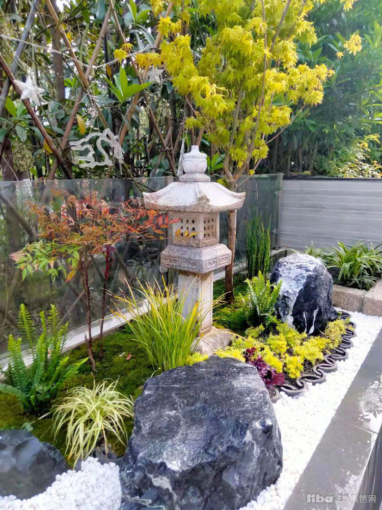 石灯笼依偎在绿枫之下,黑山石自然随意摆放,蕨类植物立于苔藓之间,既丰富植物搭配又能聚集一些视线。