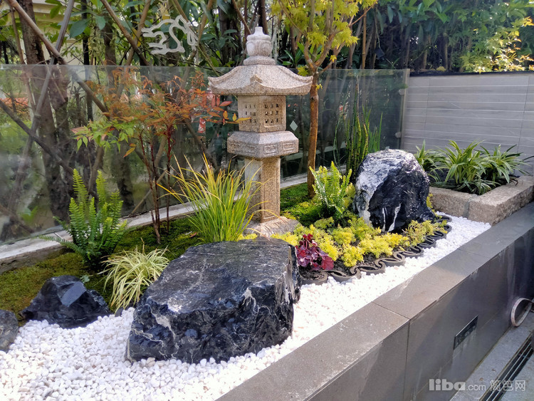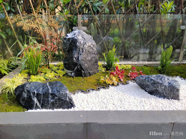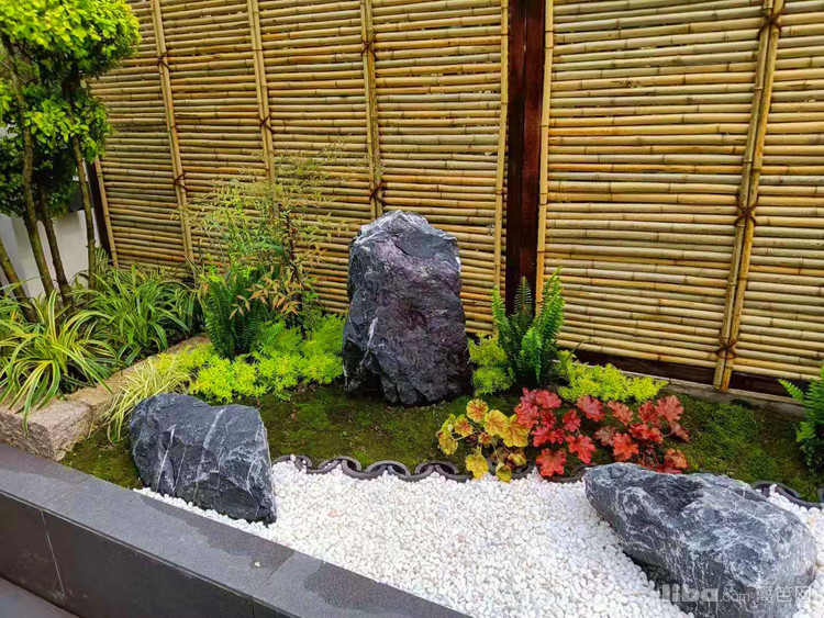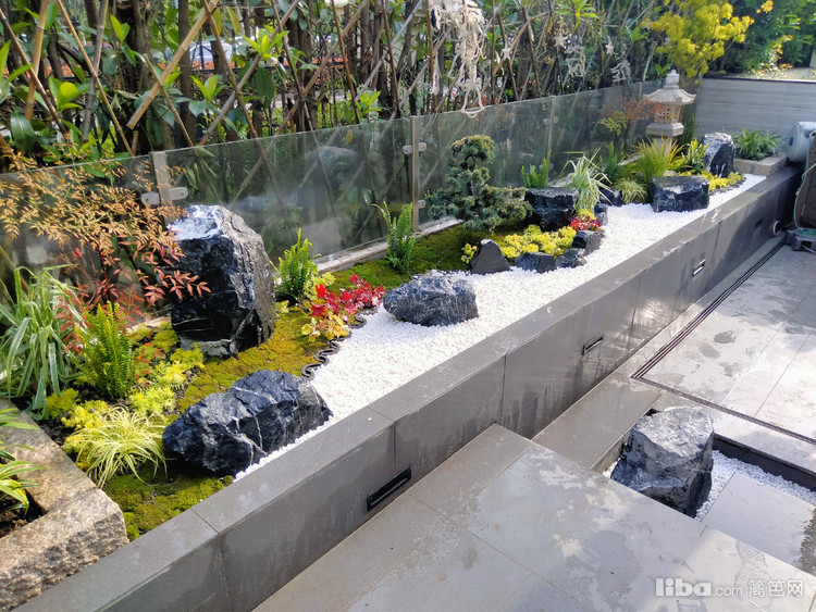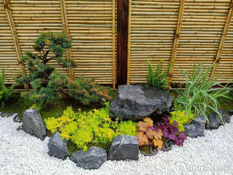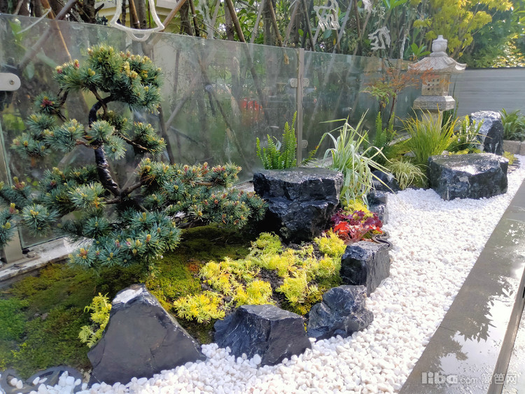 白色砂砾、黑色瓦片、苔藓将小小的空间合理隔离,犹如水溪缠绕在绿植周边,让空间呈现出别样的生机。