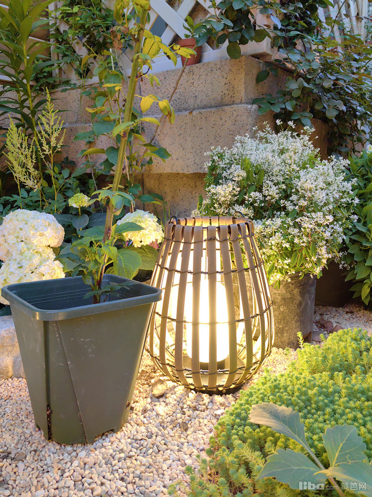 灯笼式造型灯点缀花卉绿植,温馨的灯光让人安详舒适。