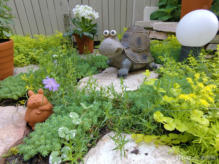 花坛没有采用原始规整的砌筑处理方式,而是将大小不一的黄木纹石块错落有致的放置