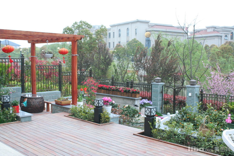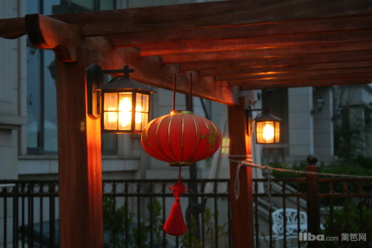 防腐木廊架,配上喜庆的红色灯笼,颇有几分古代富贵人家的气派。