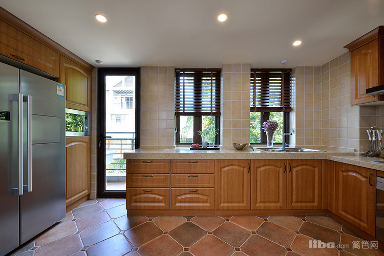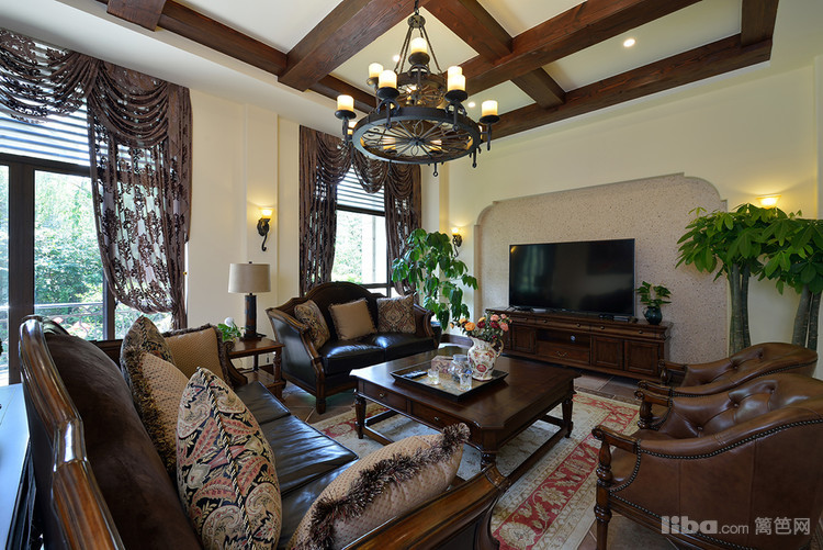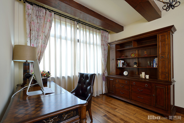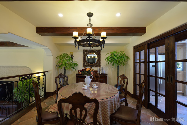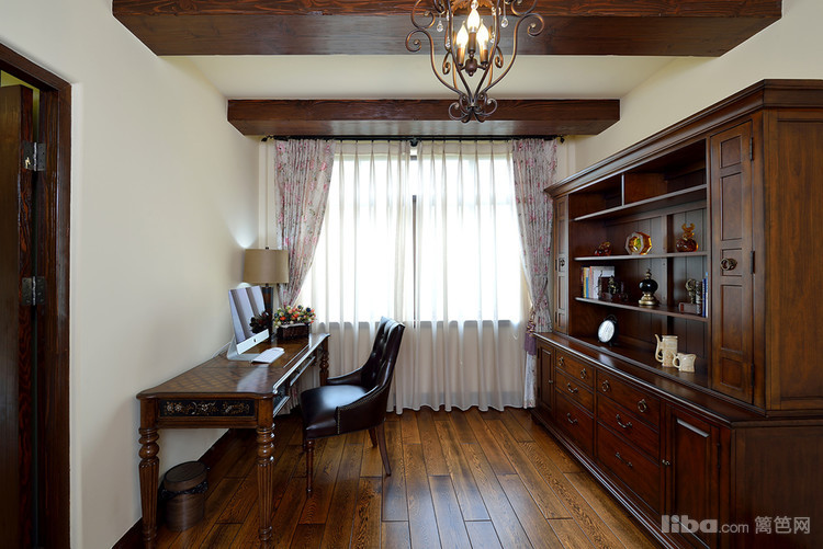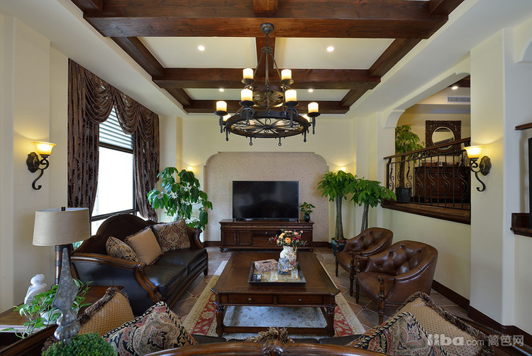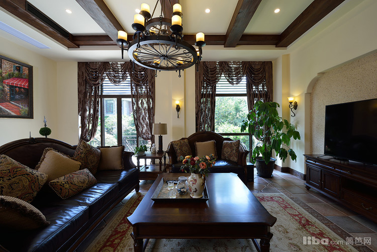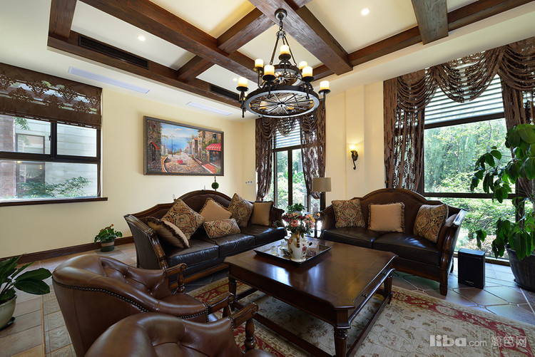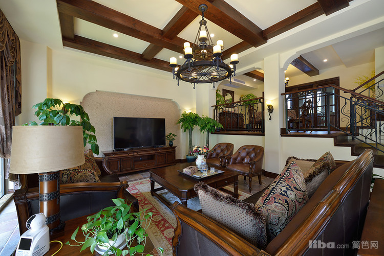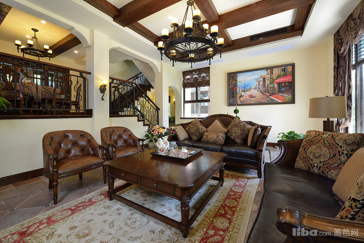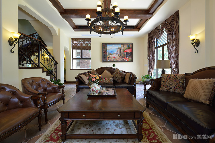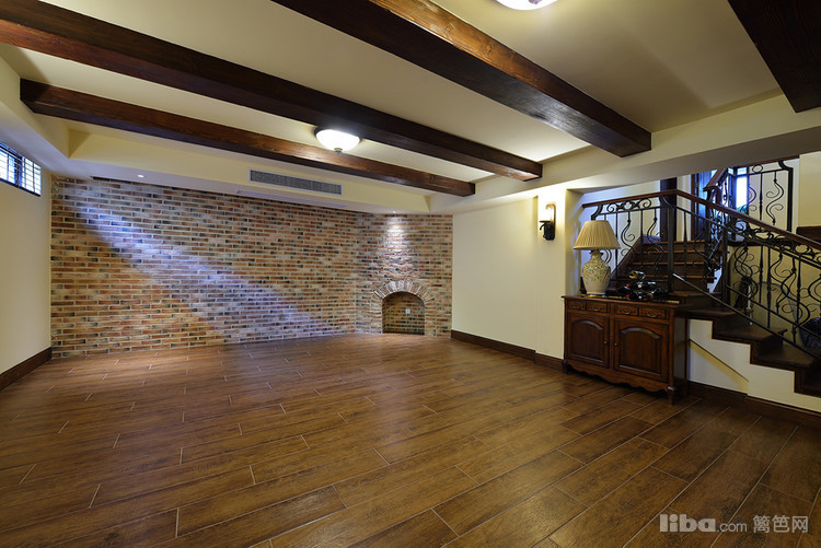 原木色为主。配饰上,金属装饰钉将室内点缀得简单而质朴
