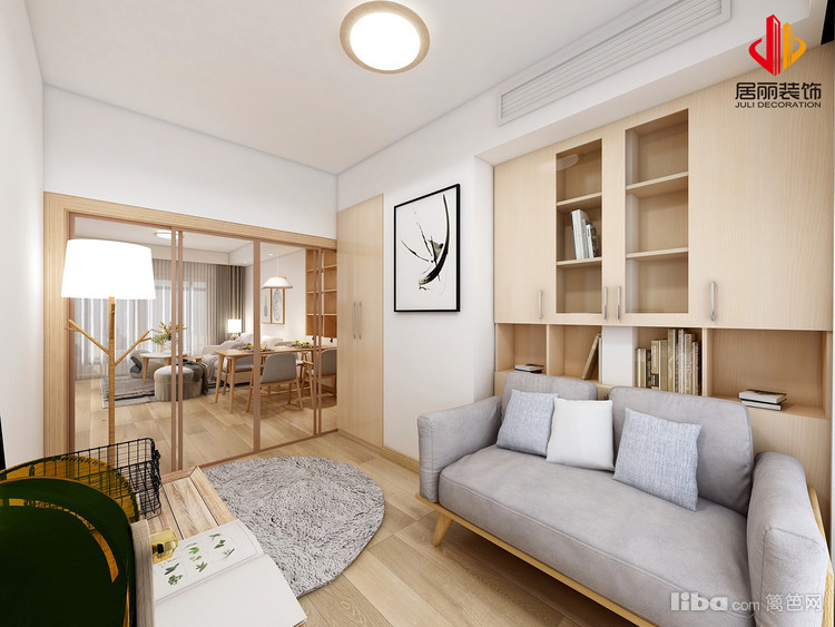 推拉门的设计,使书房客厅餐厅空间形成一个整体,增加采光通风,增强人与人之间,人与动物之间的互动。