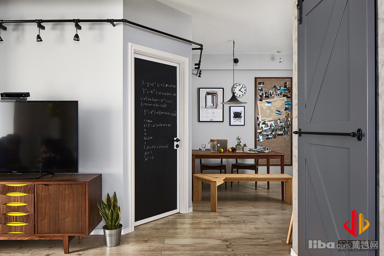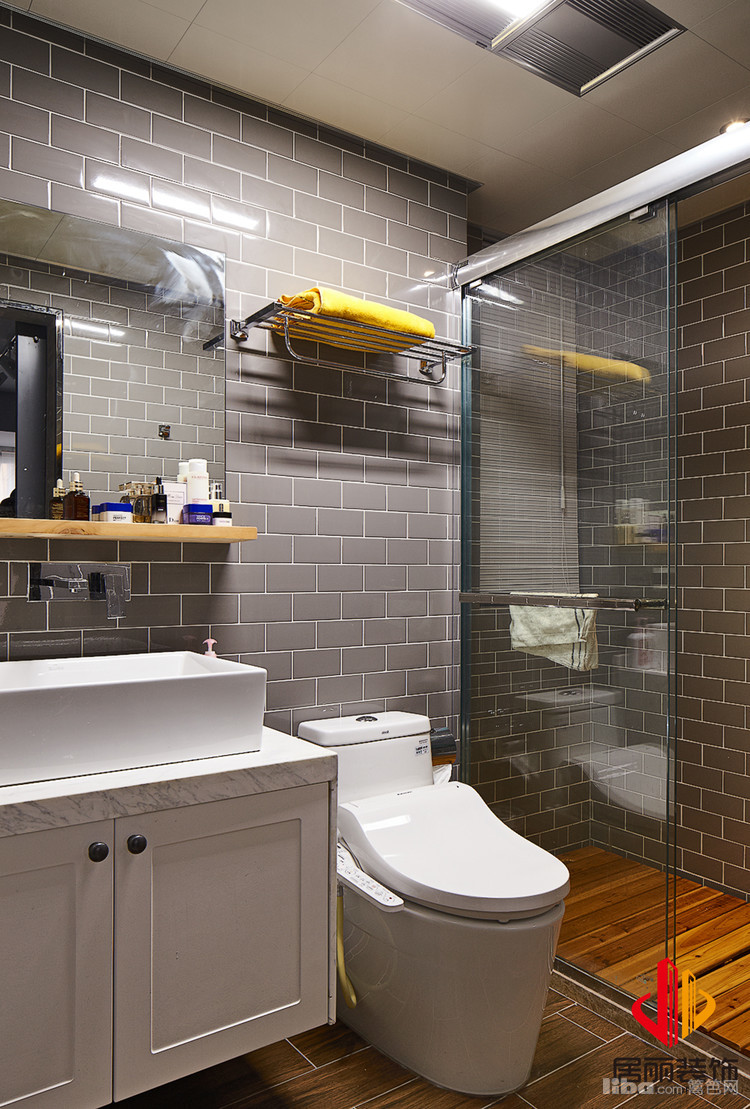 卫生间采用谷仓门,这样客厅也是一个亮点。避免卫生间门开在客厅。淋浴地面采用防腐木地面材质。