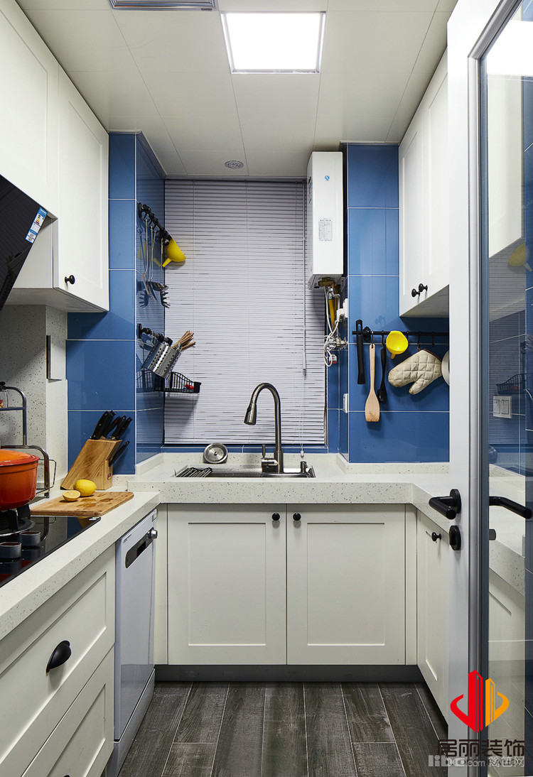 厨房采用U形设计台面,这样使用起来方便。地面采用深色的地板砖好打理,门板采用模压门板。