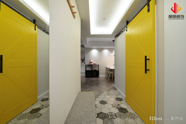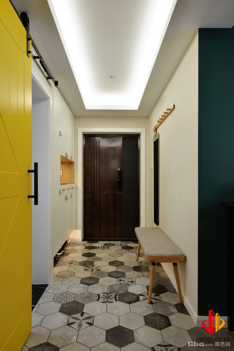 黑白橱柜经典却不俗气,菱形地砖作为厨房不突出的亮点,低调地为厨房区增色添彩。红色油烟机是业主夫妇精挑细选的,与厨房的谷仓门撞色搭配。