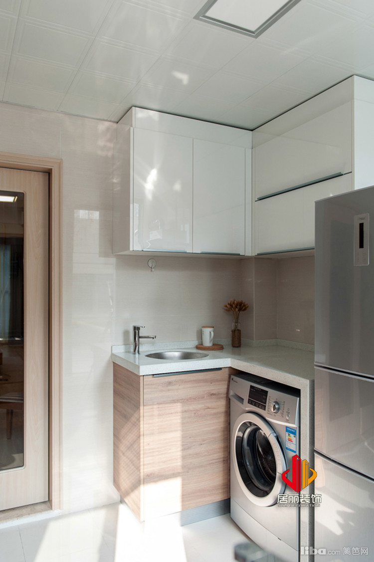 仿木纹的橱柜,从视觉上营造木质的温暖感,但造型却具MUJU风。