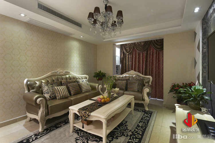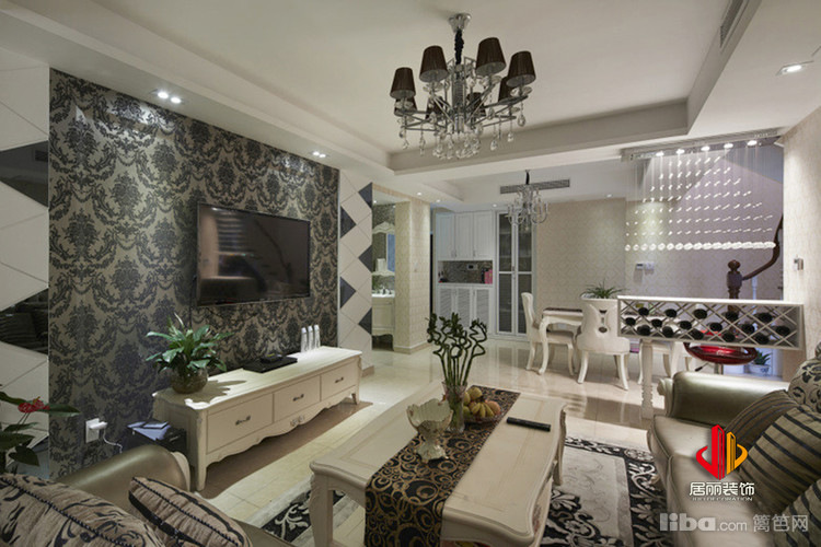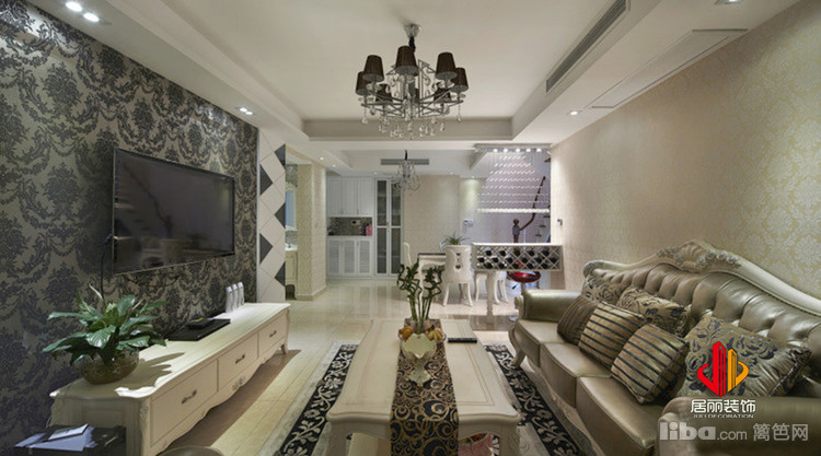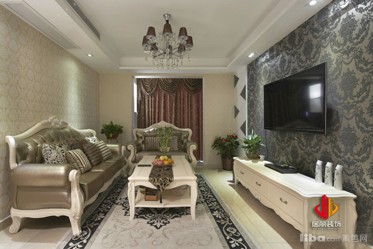 简单的吊顶设计,没有花哨的装饰,一款黑色璀璨的吊灯增添了欧式吊顶华丽浪漫的视觉感。