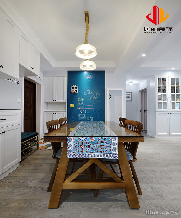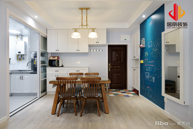 餐厅与门厅结合,因为平时使用人口较多,餐桌居中摆放方便使用,餐边柜可作为厨房的功能延伸,作为西式小家电的操作区