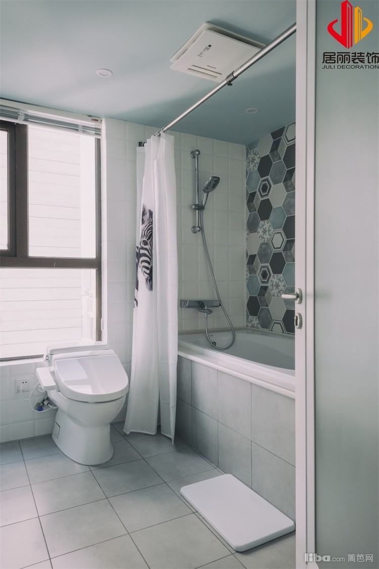 主卫设计在主卧套间内,功能齐全。象牙白大理石纹路瓷砖搭配品质洁具、质感顶灯,整体空间干净利索,时尚舒适。