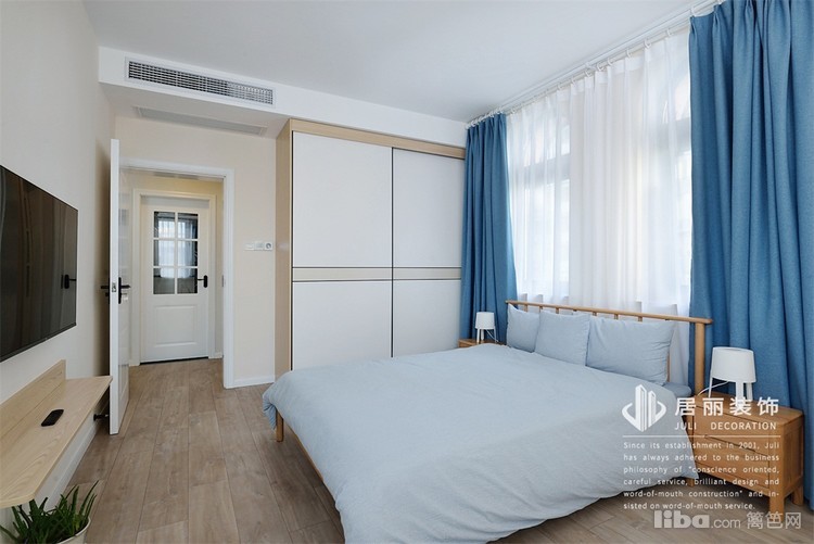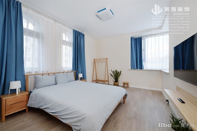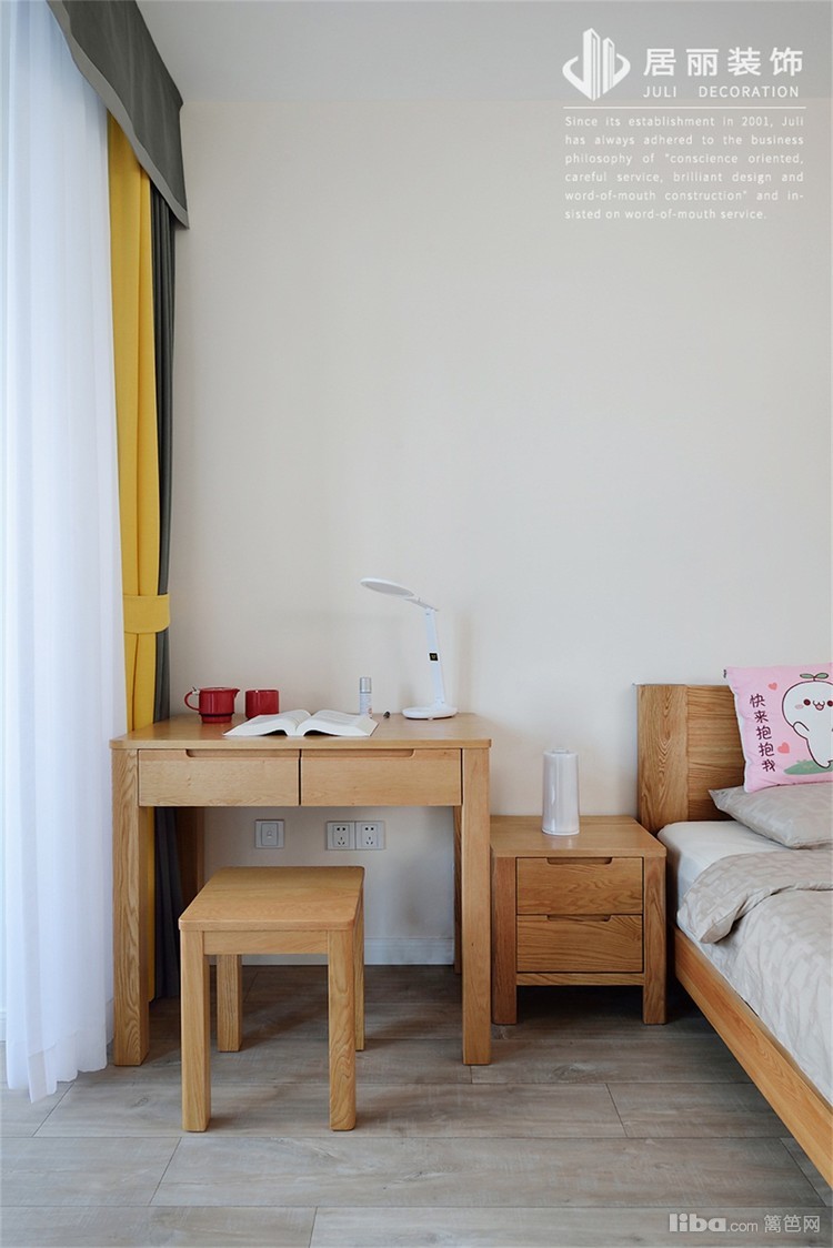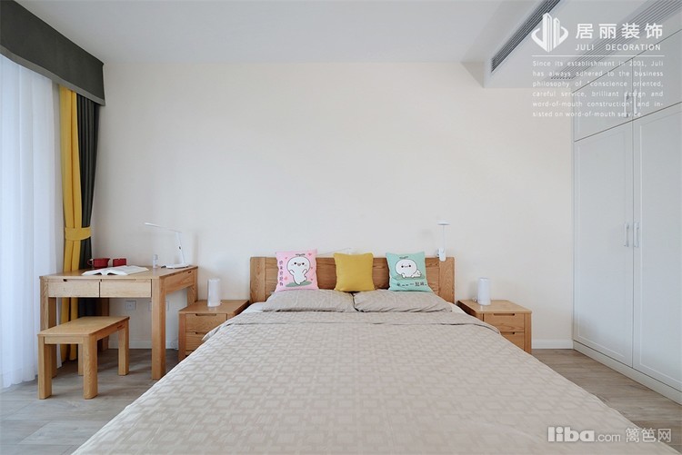 次卧墙面使用浅黄色,家具和配饰和整体呼应,还是原木色家具,蓝色窗帘和浅蓝色床品颜色呼应。