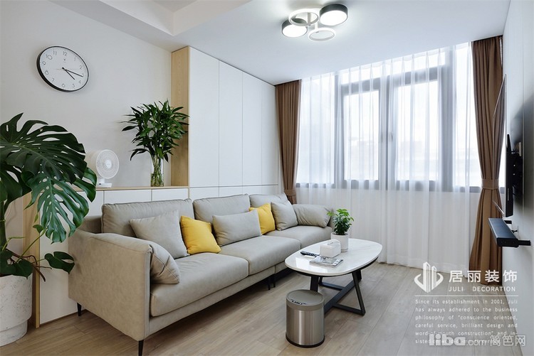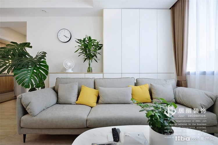 把阳台的剪力柱包在柜子中,修饰空间。直线条的柜体沙发背景,质感硬朗,用黄色抱枕打破一下。