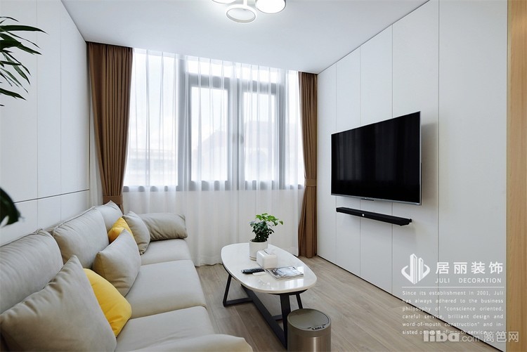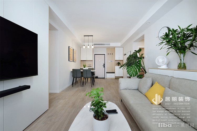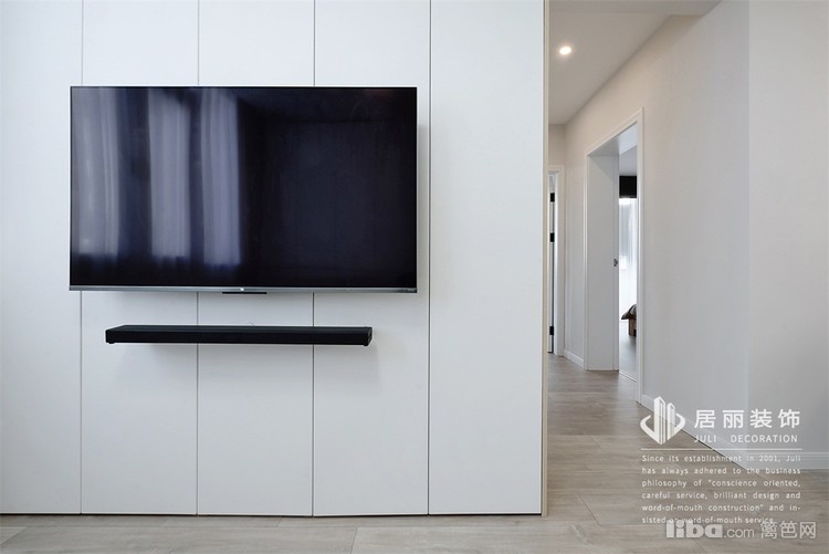 电视后面也有剪力柱,也用白色木饰柜修饰,并增加储物功能,只有电视并未添加电视柜,很好的避免卫生死角。