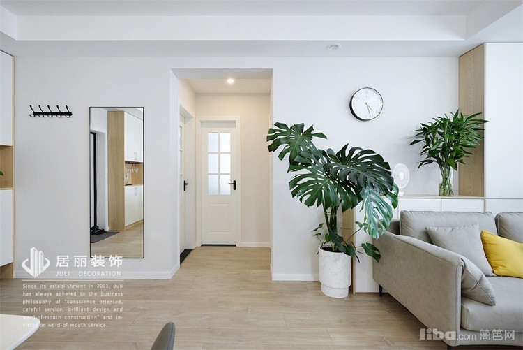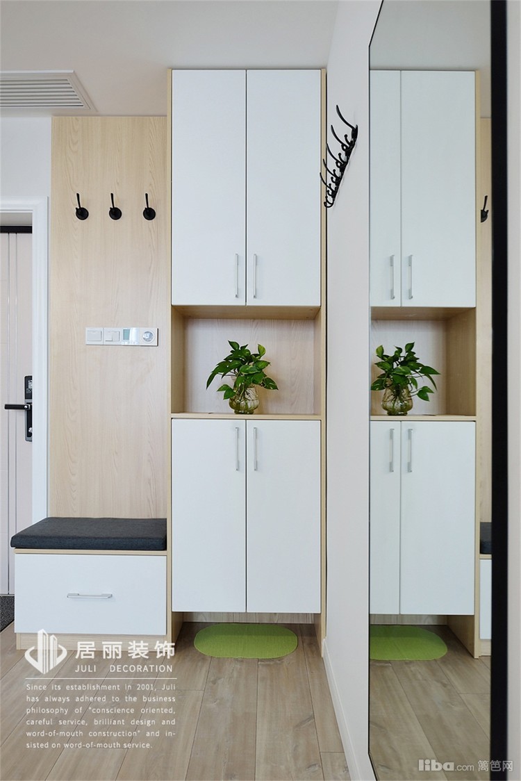 另一侧墙面挂了全身镜,用于日常出门检查着装,看得出业主很注重个人形象。