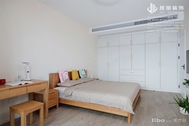 主卧使用了一整排的衣柜,让储藏功能达到最大,家具同样采用了北欧原木色系,使得整个空间看上去非常的宽敞明亮。
