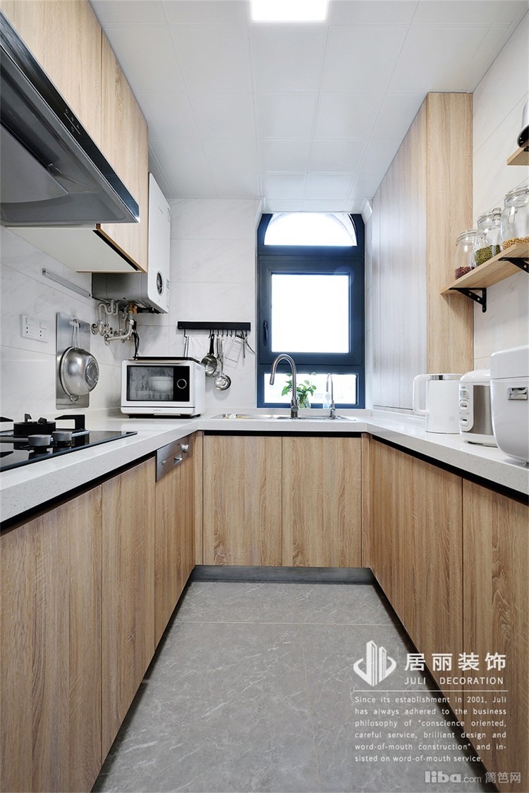 厨房采用北欧原木色,水槽处采用了感应灯带,U型厨房靠南的那排柜子上方用层板代替吊柜,使整个厨房空间显得不那么压抑。
