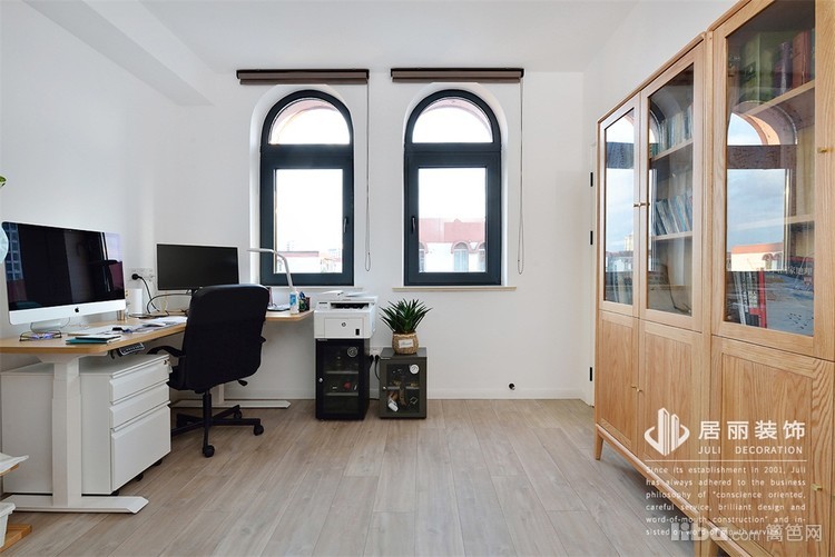 书房采用了原木色的实木家具,业主平时喜欢站立着办公,所以采用了升降式的书桌,适合站立办公的需要。