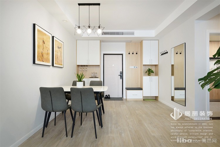 在入户处做了鞋柜和餐边柜,且在旁边放置了一面全身镜,餐厅的挂画照片是业主在非洲自己拍摄的,业主是摄影爱好者。