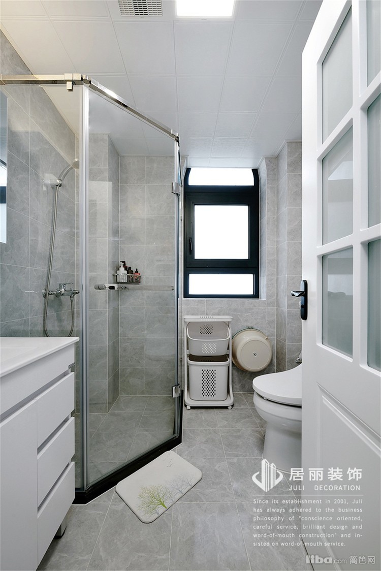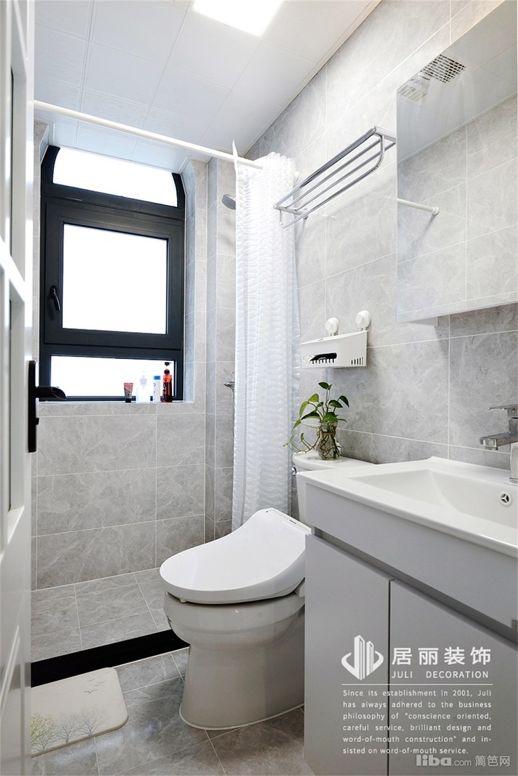 次卫整体为白色,空间更加干净,考虑空间较小,采用浴帘隔断。窗户边向外沿展,可以放置洗漱用品。