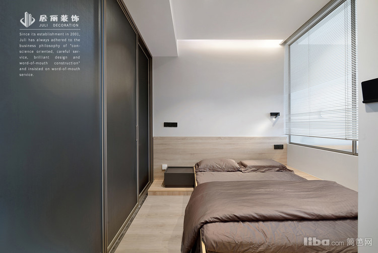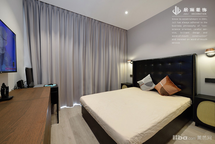 主墙面采用干净的白色,背景墙采用灰色搭配同色系的灰色窗帘以及黑色的软包床,整体干净简洁又有质感。