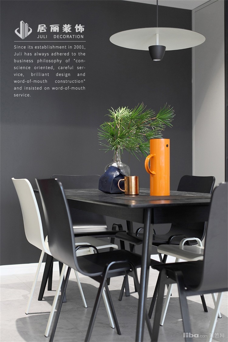 搭配自然的绿植装饰,整个用餐空间弥漫着文艺的气息,黑白的相间搭配,简约又高级的同时也不会审美疲劳。