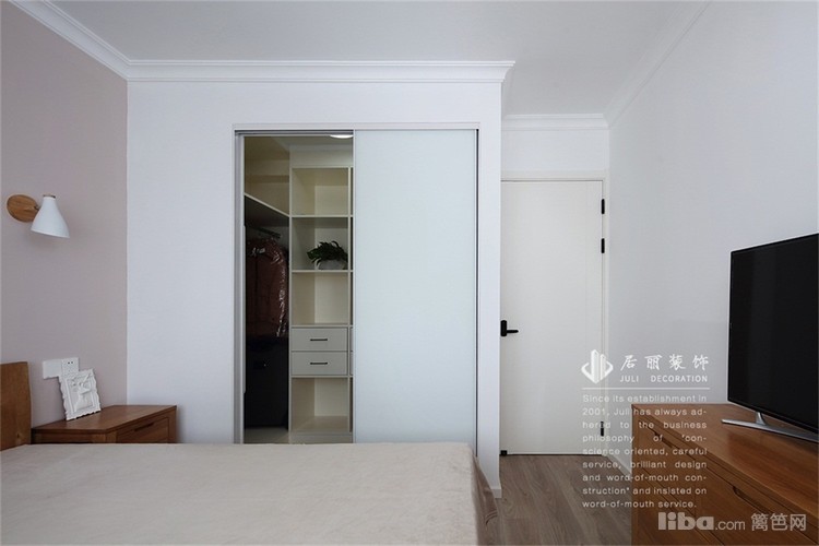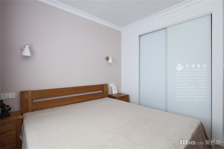 主卧室整体以简洁出发,延用总空间的简约基调,主卧墙面加了些粉调,符合女屋主浪漫可爱的性格。