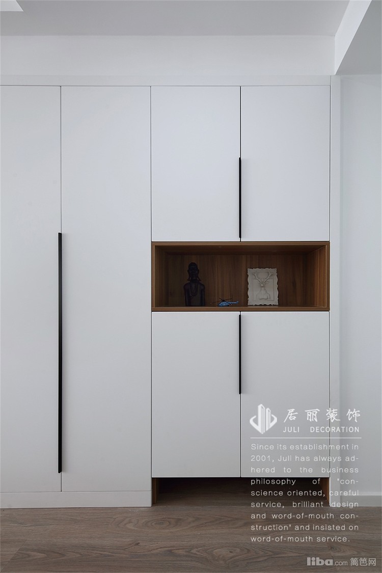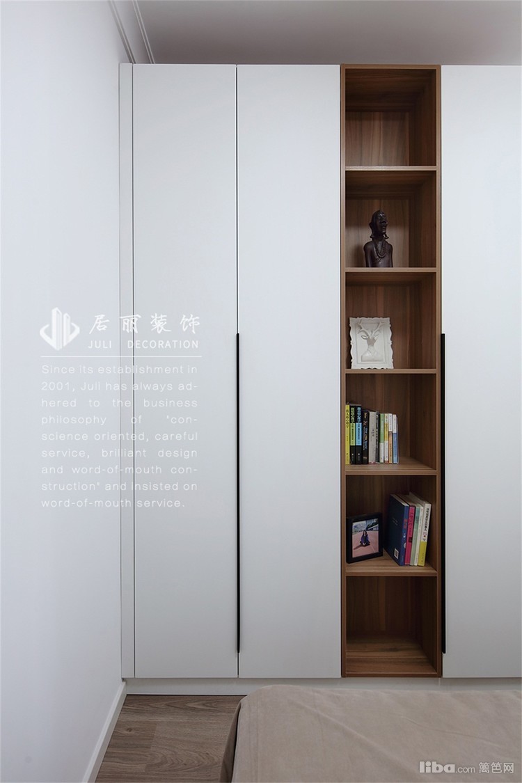 房型改动之一就是增加了衣帽间。缩小主卧和次卧的长度,增加U型衣帽间,供业主摆放衣物和物件。在次卧室,同样放置了一个衣柜和置物书柜。大大增加了储物空间。