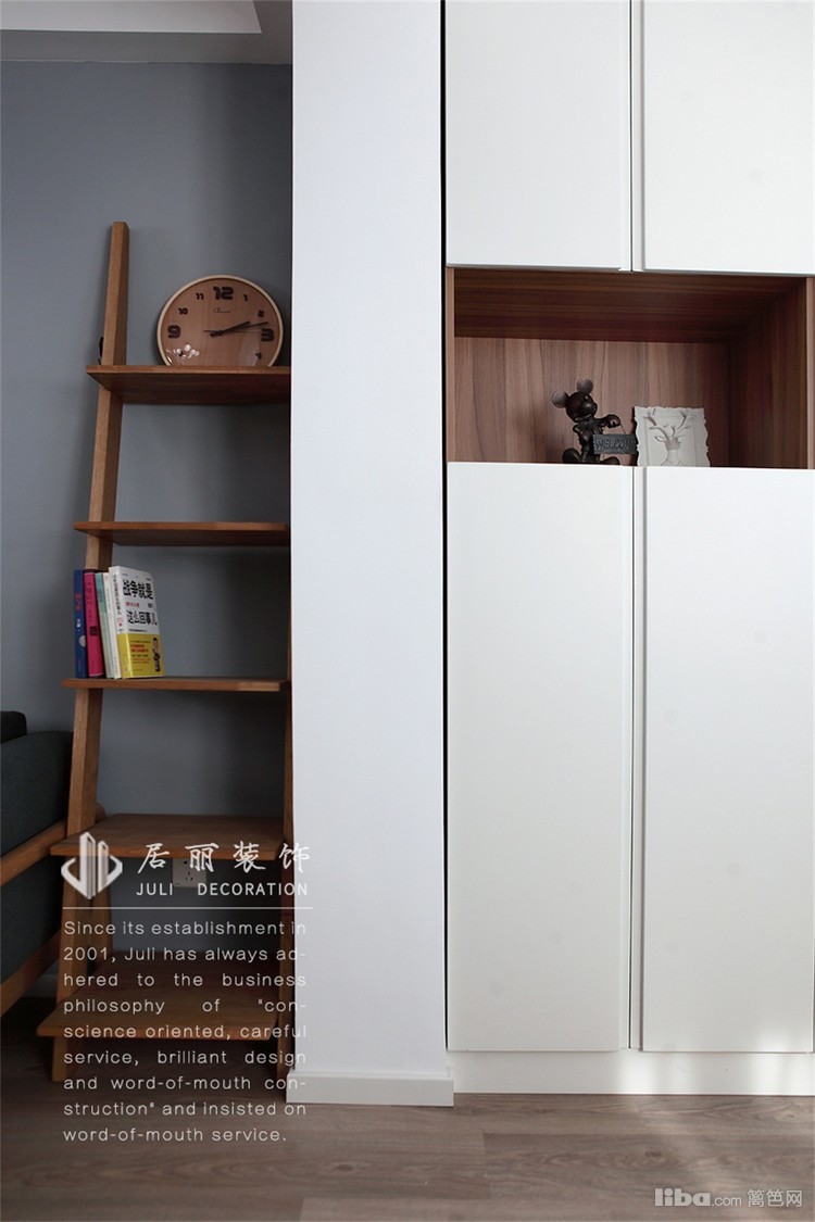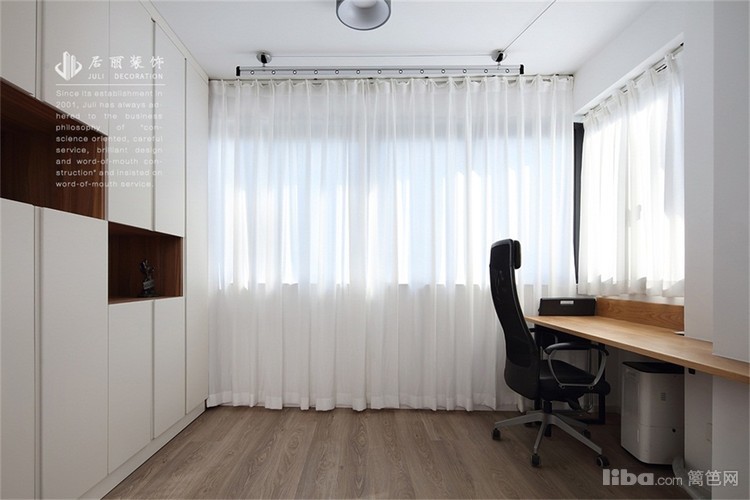 阳台相对较大,业主提出希望有个独立的读书区域。设计师就将阳台改成了一个开放式的书房。书桌的对面一排置物柜。