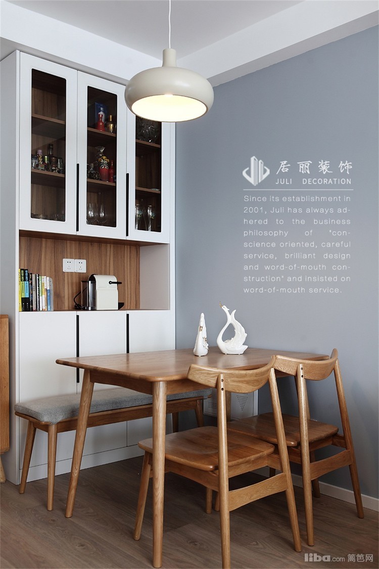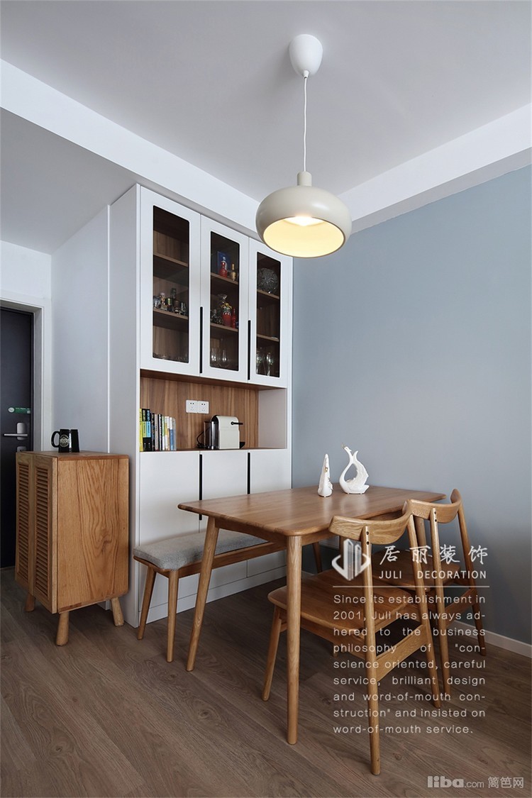 利用了旧餐桌,并在餐桌旁做了白色餐边柜,可以储放一些小家电。