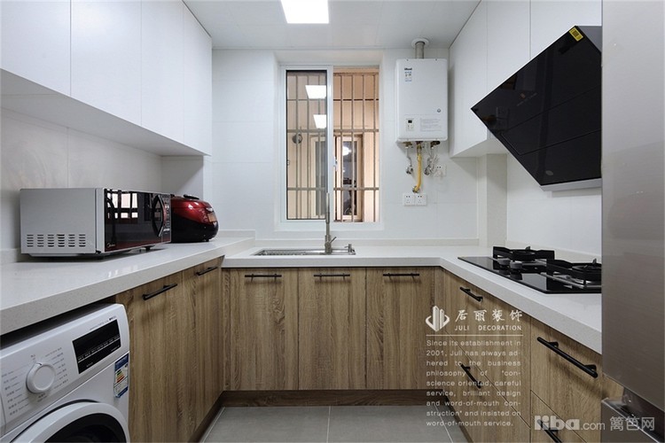 采用U型设计,在色彩上白+木的质感。业主不希望阳台走水,所以设计师将洗衣机放到了厨房的台面。