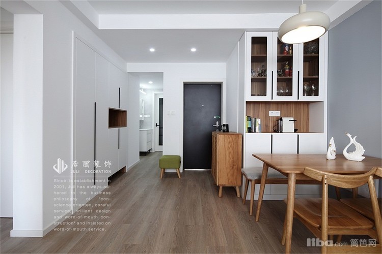 入户门正对客餐厅,将墙体改成嵌入式的置物柜,这样玄关区域的置物空间也多,也弥补了鞋柜少的缺陷。