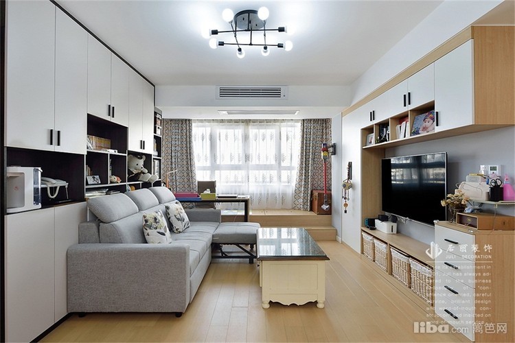 客厅沙发后做了一排柜子增大了储物空间,柜体采用深色板材,与浅色门板相互衬托反差立体感。