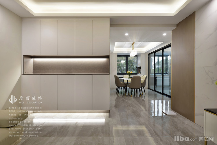 ▪为保证空间的错落感,客餐厅一体化的通透感,整体餐边柜采用柜底悬空+暗藏上下灯带设计。
