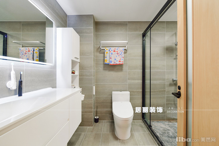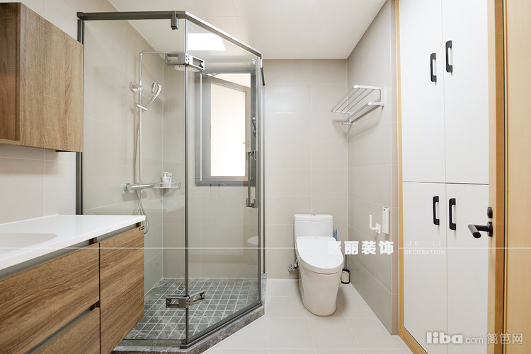 主卧卫生间。用玻璃门隔开淋浴和梳妆的地方,小空间里也可以实现更多可能。