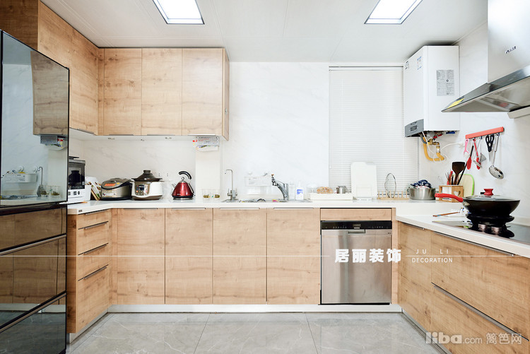 U型设计,灰白墙地砖搭配原木色橱柜,使整个空间干净利落。