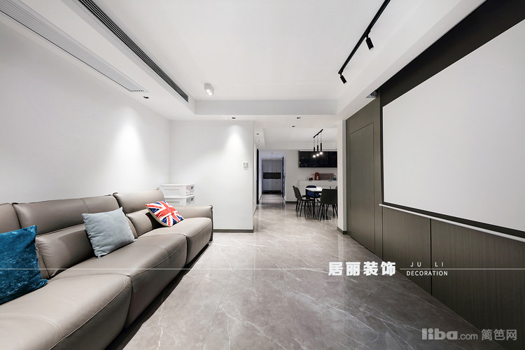 客厅空间主旋律上选用灰黑色,无主灯的设计让顶面更加干净简洁,拉高视觉纵深感,让整个空间更加连贯。
